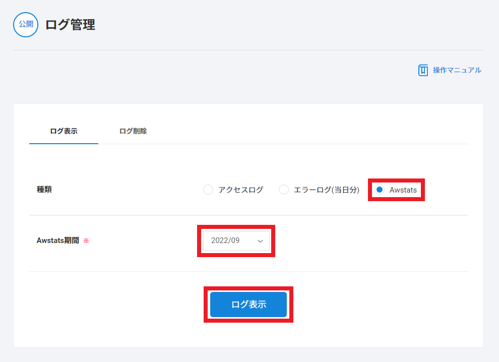 2 【Awstats】をクリックし、【Awstats 期間】を選んだ上で【ログ表示】をクリックします