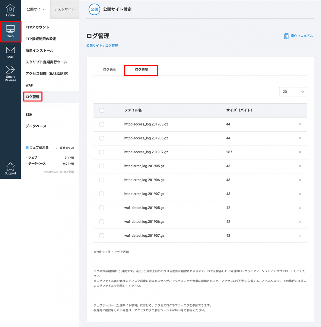 ログファイルは 3 ヶ月で自動的に削除されますが、それを待たずしてお客さま側で削除したいといった場合にご利用いただきます。