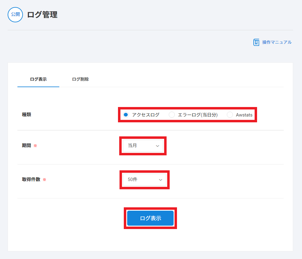 2 閲覧したいログの種類・期間・取得件数を選択して【ログ表示】をクリックします