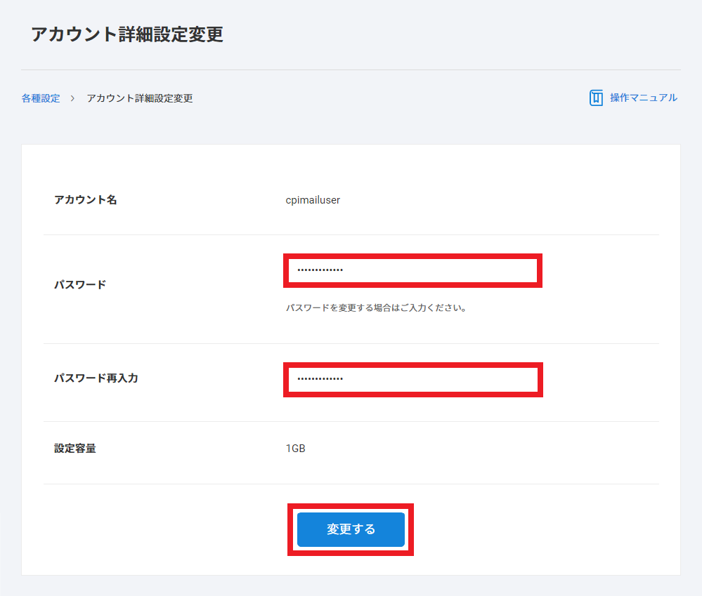 「メールアカウント(ユーザー用)」でのメールアカウントのパスワードの変更方法をご説明します。
