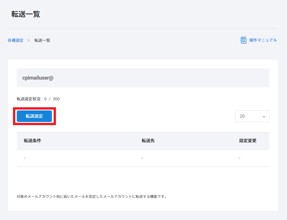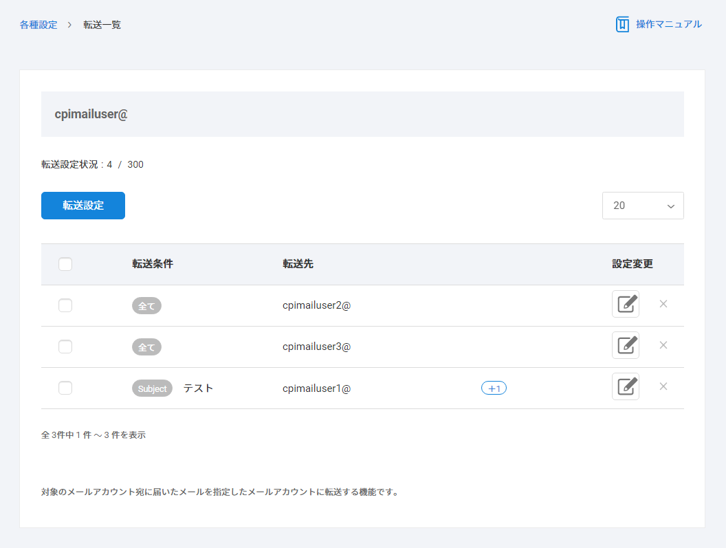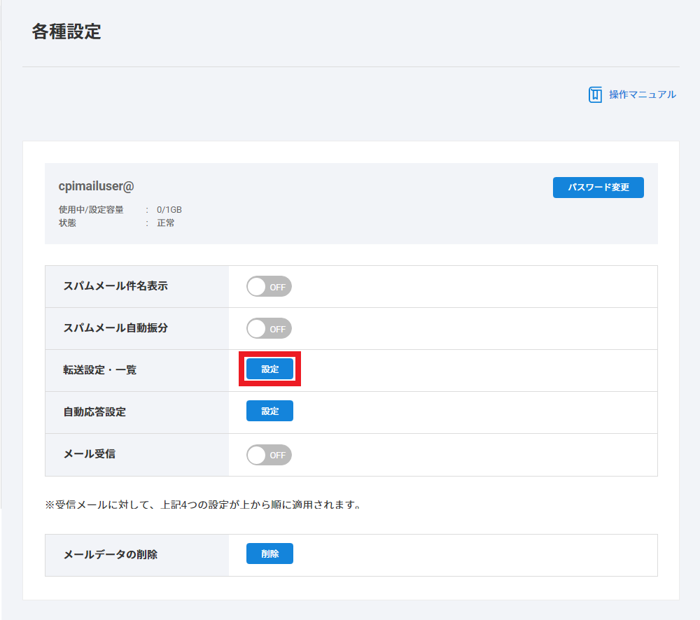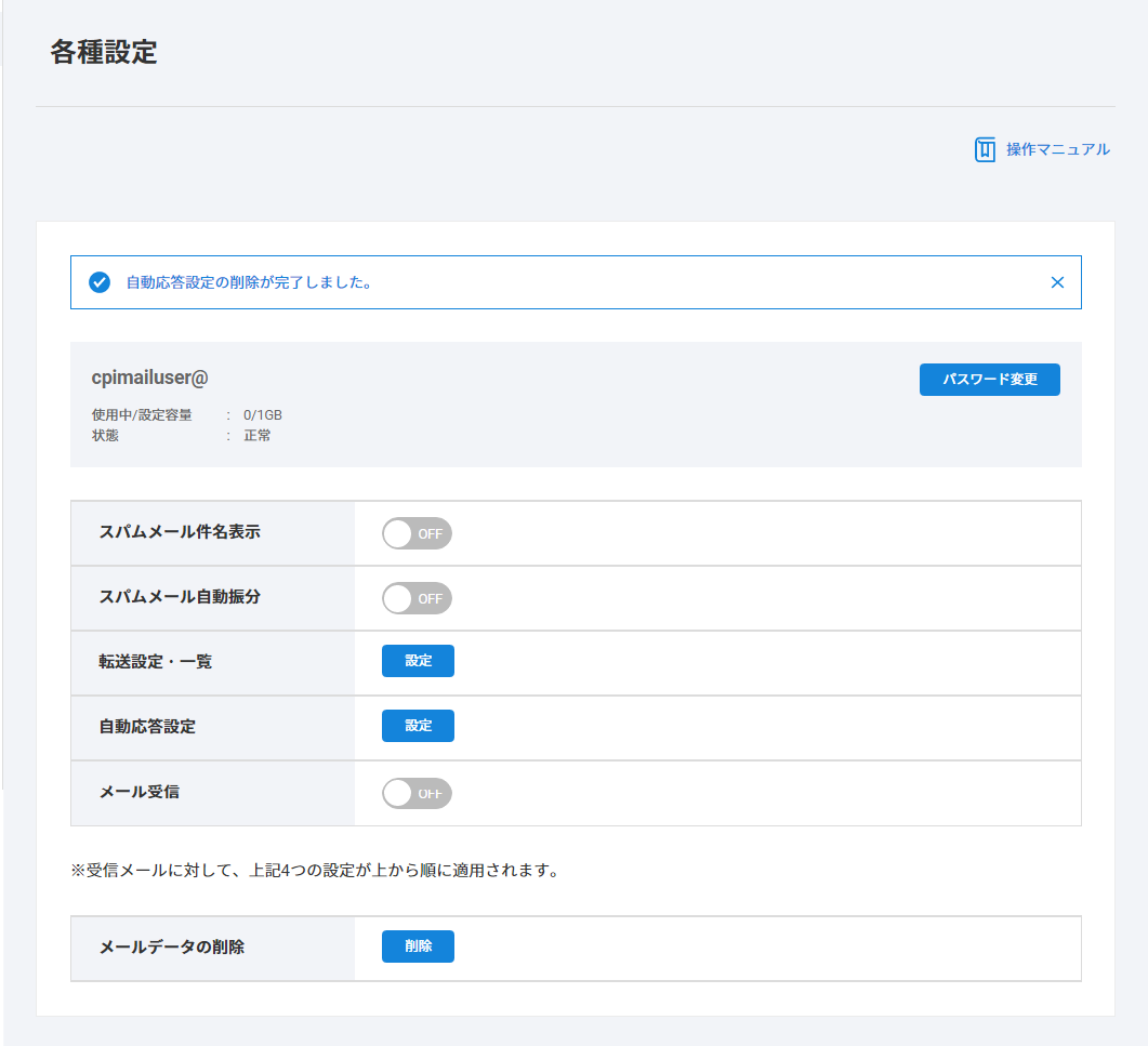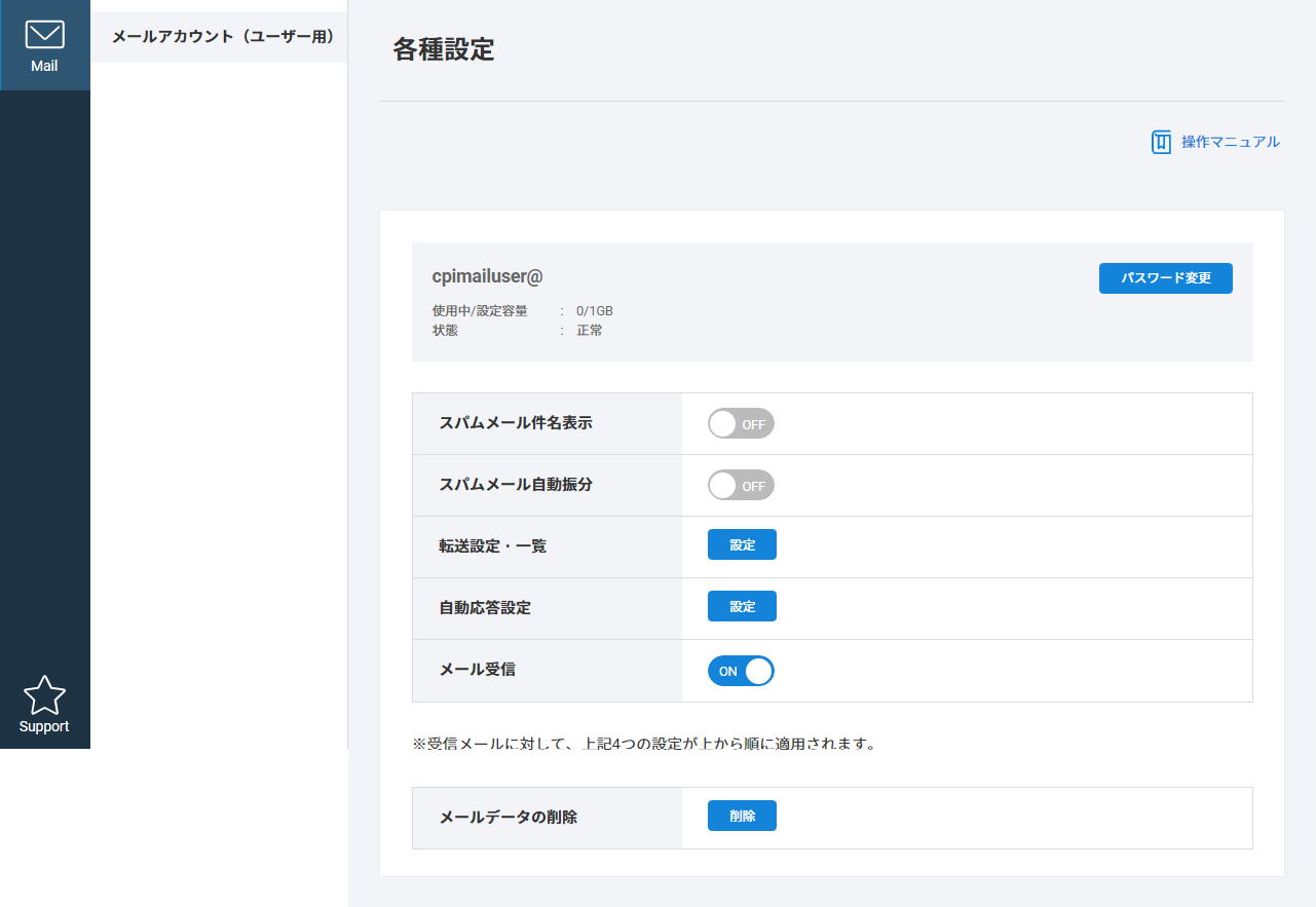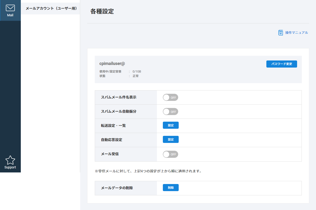 本機能により、各ユーザーが自分のメールアカウントのパスワード変更や転送設定、自動応答設定をおこなうことができます。