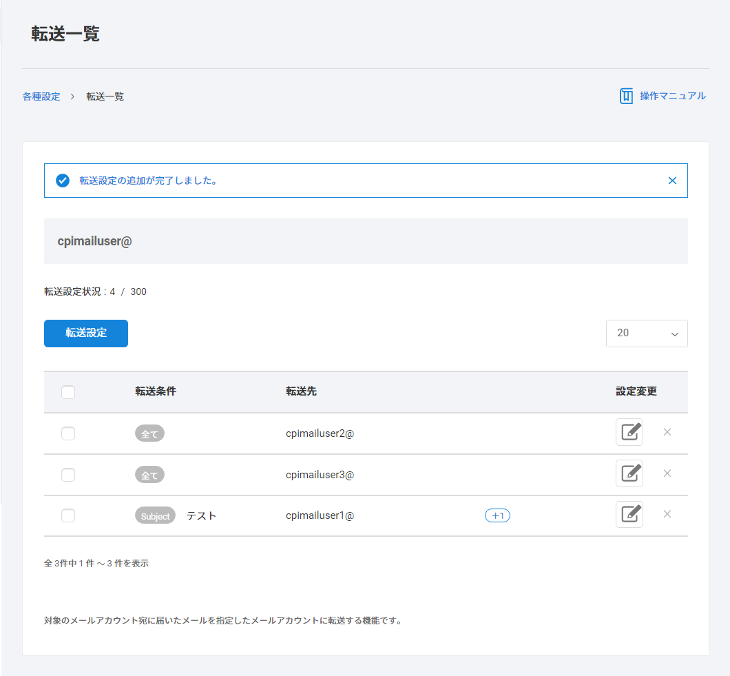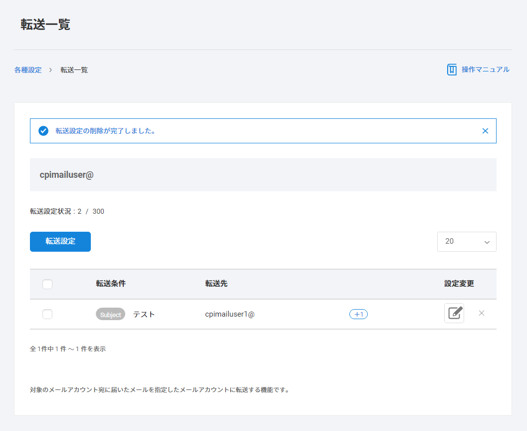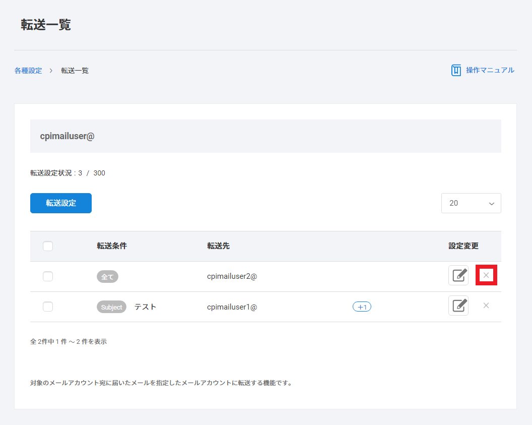 | アカウントの転送設定・変更・削除 | 〇(全アカウント) | 〇 |