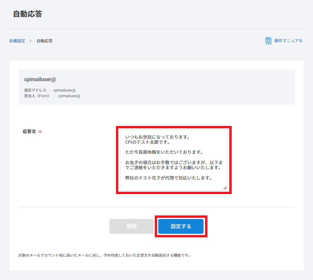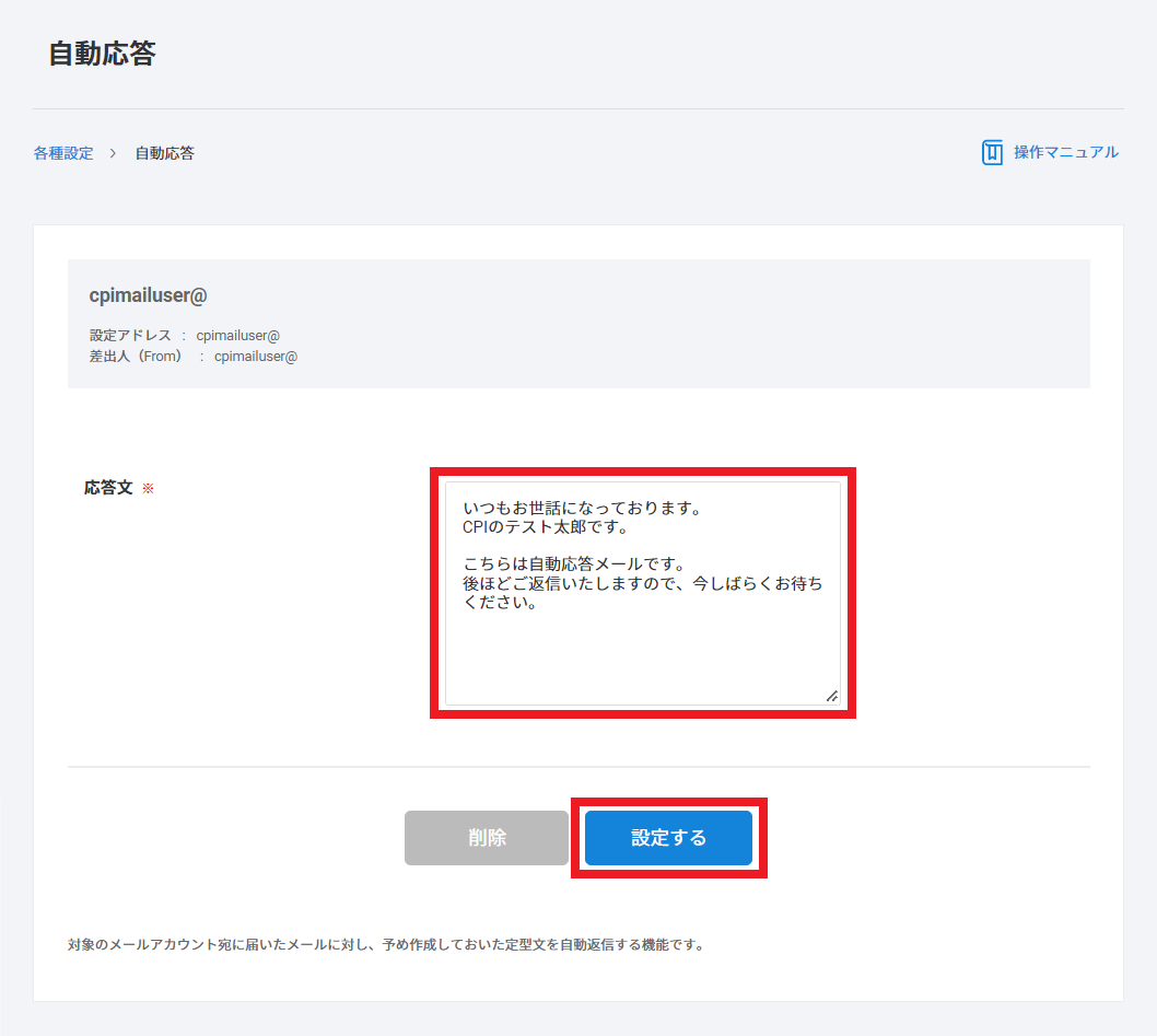 3 返信用の応答文を入力し、【設定する】をクリックします