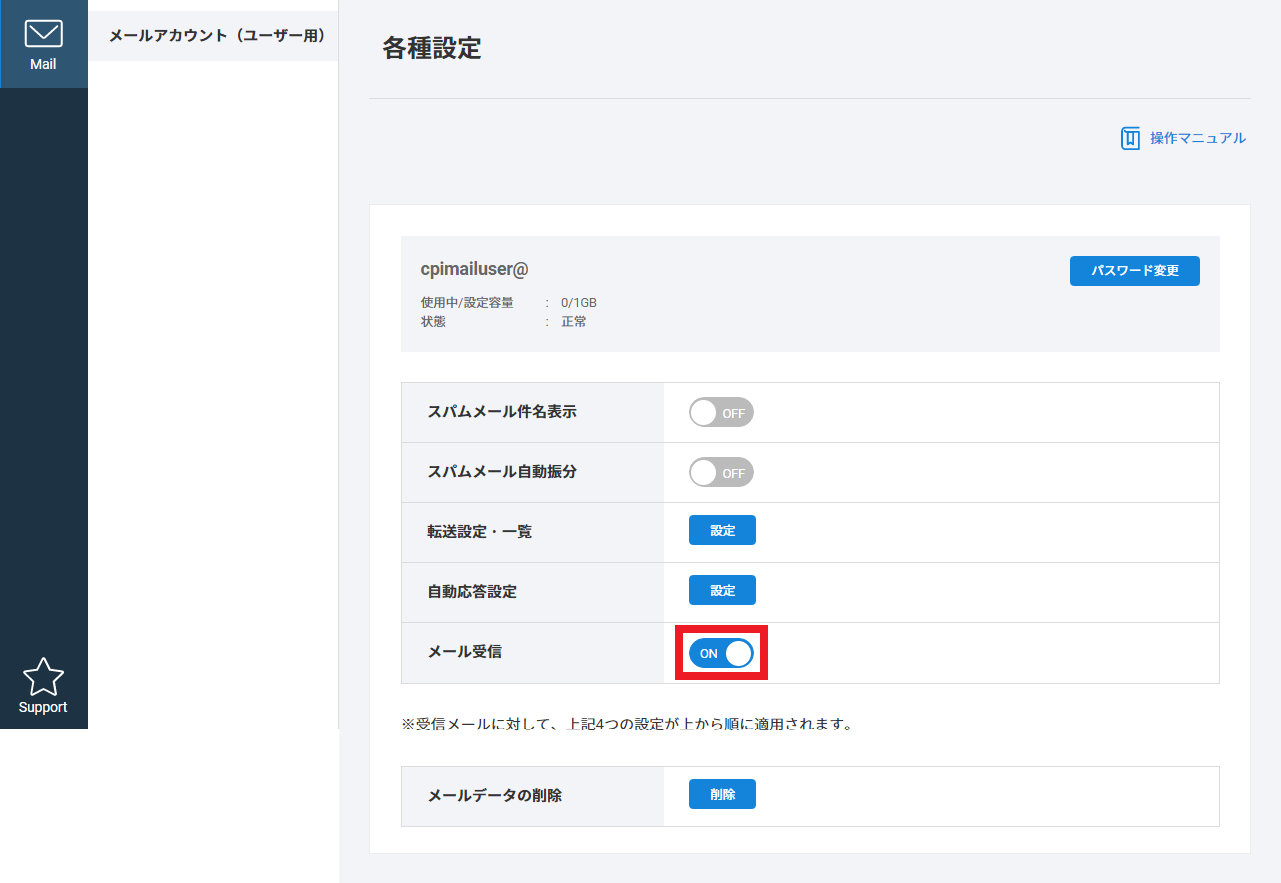 | OFF の場合 | メールボックスに残らない設定になります。 そのメールアドレスでの受信は行えないため、送信専用、 もしくは他メールアドレスへの転送(中継)用といった用途でご利用ください。 |