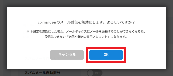 メールアドレス運用中にメール受信機能を ON → OFF に設定変更した場合、それ以降は該当アドレスでのメール受信はできなくなります。