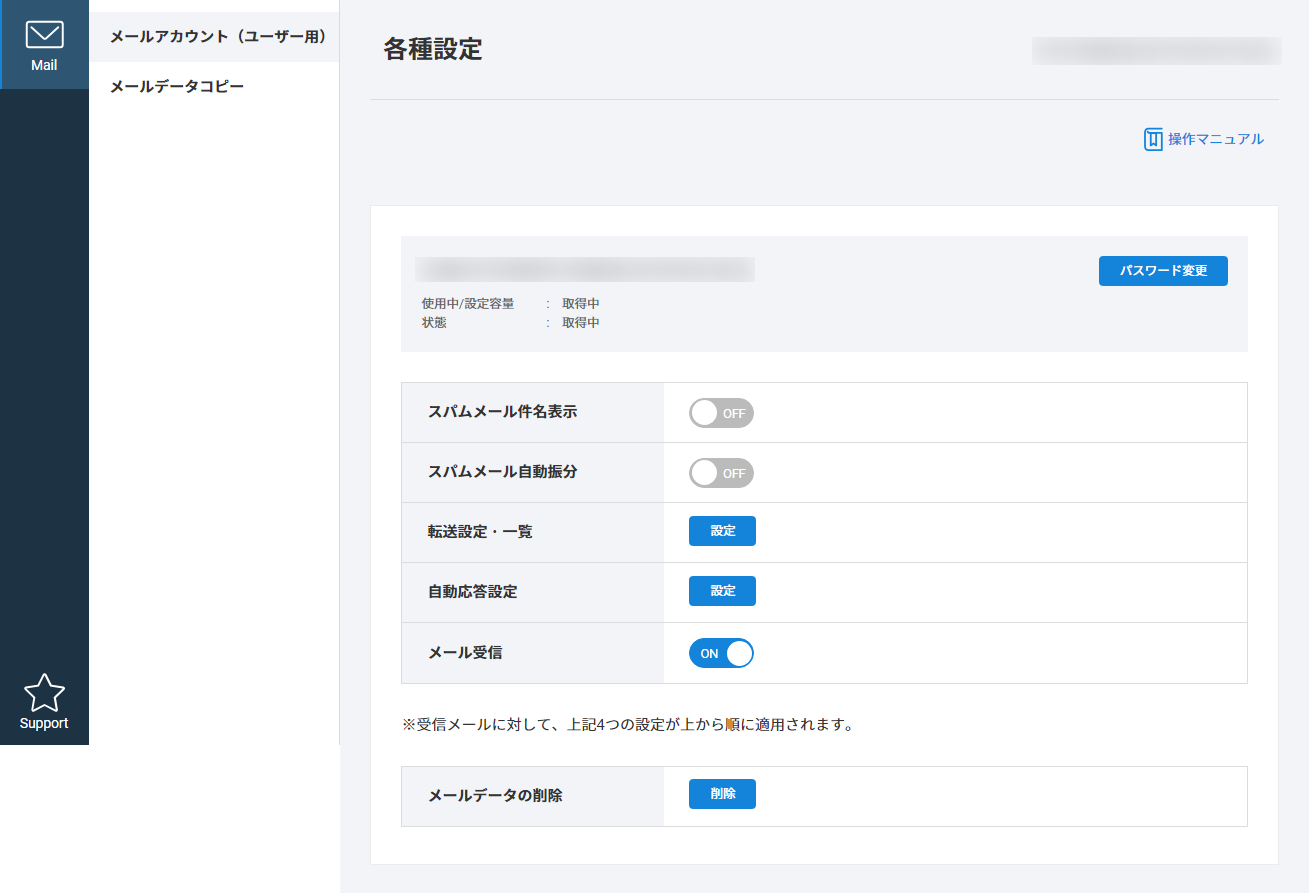 - メールアカウント(ユーザー用)では、設定容量の変更や、コメントの追加・変更は行えません。