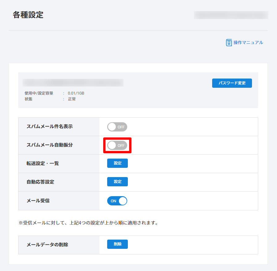 - POP 接続をご利用いただいている場合、振り分けされたメールをメールソフトでは確認できないため、当機能は【OFF】(デフォルト設定)とすることをおすすめします。