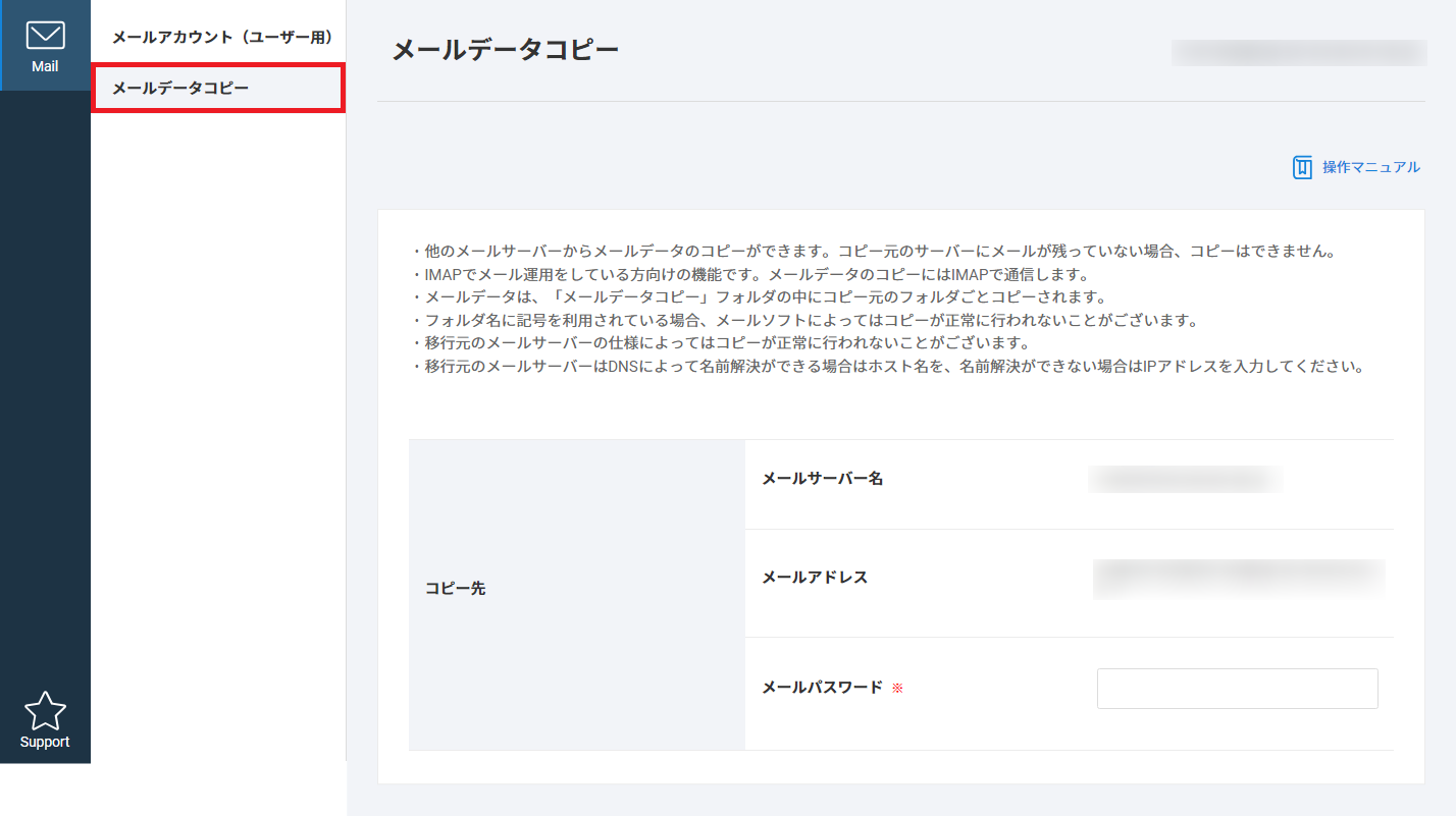 - コピー元として指定できるサーバーは、IMAP 接続が可能なメールサーバーです。