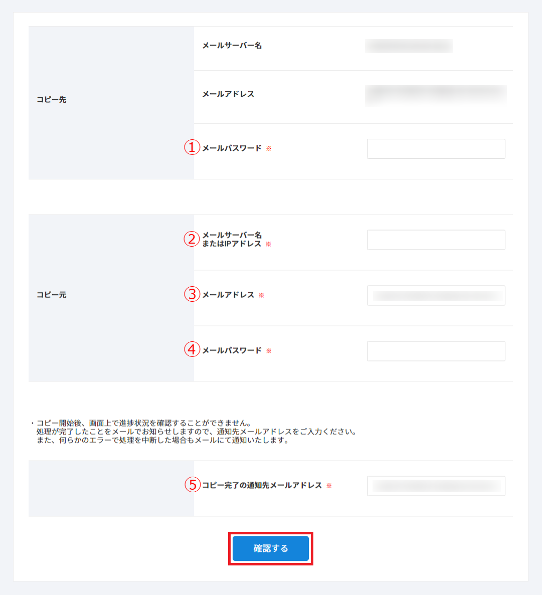 | ⑤コピー完了の通知先メールアドレス | コピー実行後に結果を送信するメールアドレスを入力してください | |