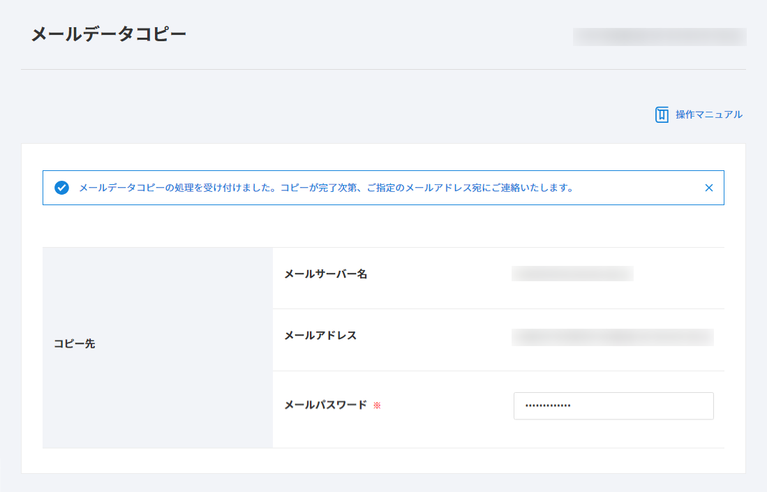 | コピー先 | ①メールパスワード | メールアカウント(ユーザー用)へのログイン時のパスワードを入力してください |