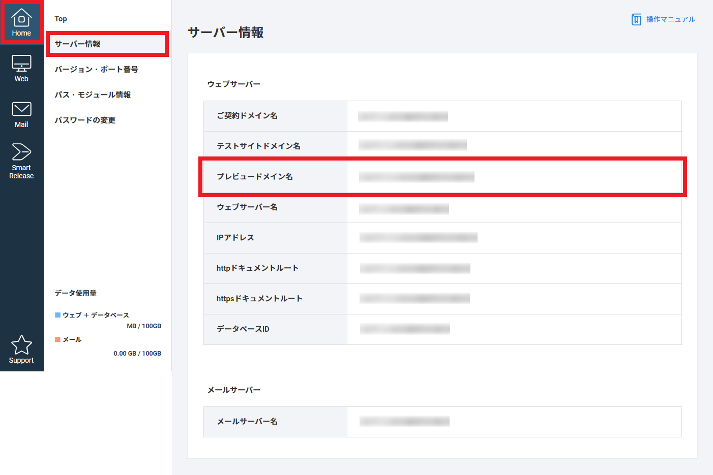 コントロールパネルへログイン後、【Home】>【サーバー情報】をクリックし、「プレビュードメイン名」に記載されたドメイン名をご確認ください。