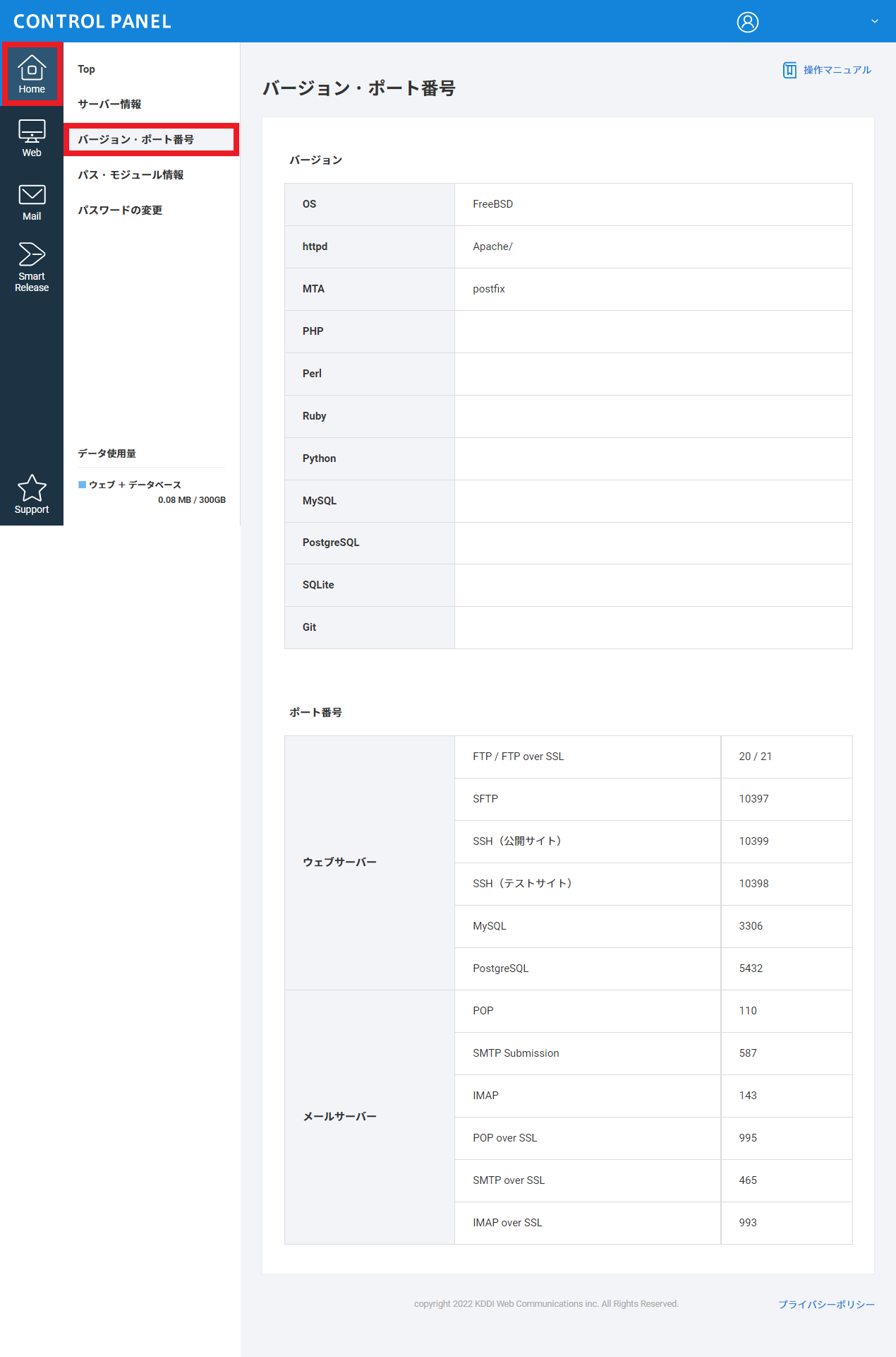 お客さまにご利用いただいているサーバーの、OS や PHP 等の CGI におけるバージョン情報、またご利用可能なポート番号の情報をご確認いただけます。