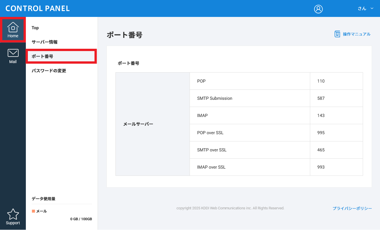 | ポート番号 – メールサーバー | メールサーバーでご利用いただけるポート番号を確認できます。 |