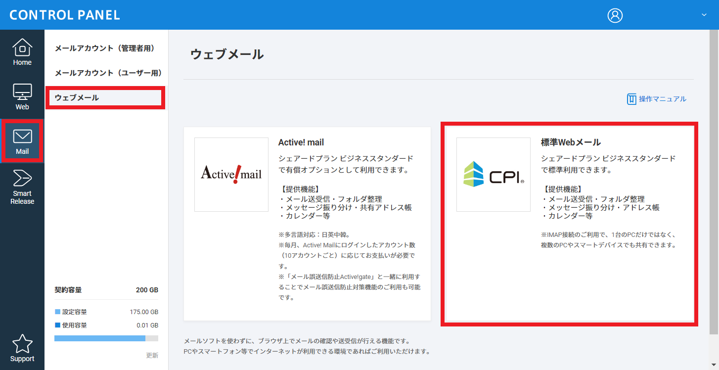 1 コントロールパネルにて、【Mail】>【ウェブメール】>【標準 Web メール】とクリックし、ログイン画面にアクセスします