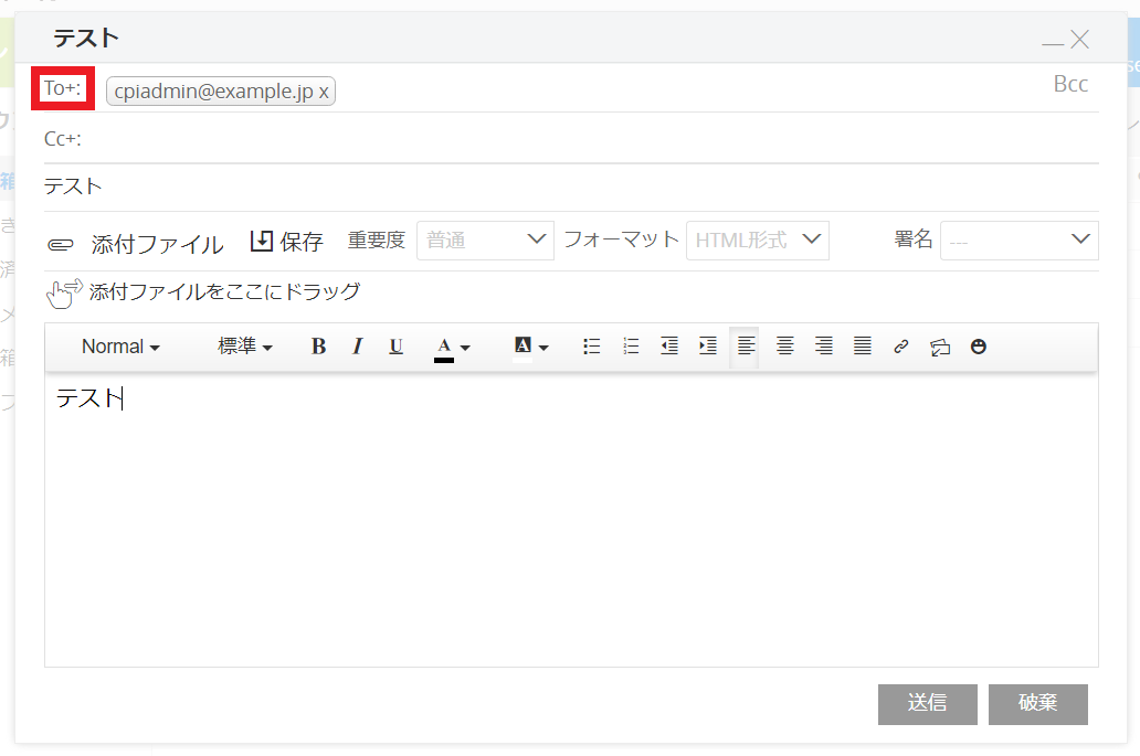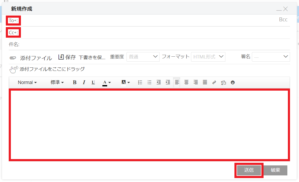 送信先は、直接入力やコピー&ペーストでの入力のほか、TO、CC の文字列をクリックすると連絡先一覧からの選択も可能です。右下の「送信」ボタンをクリックして送信します。