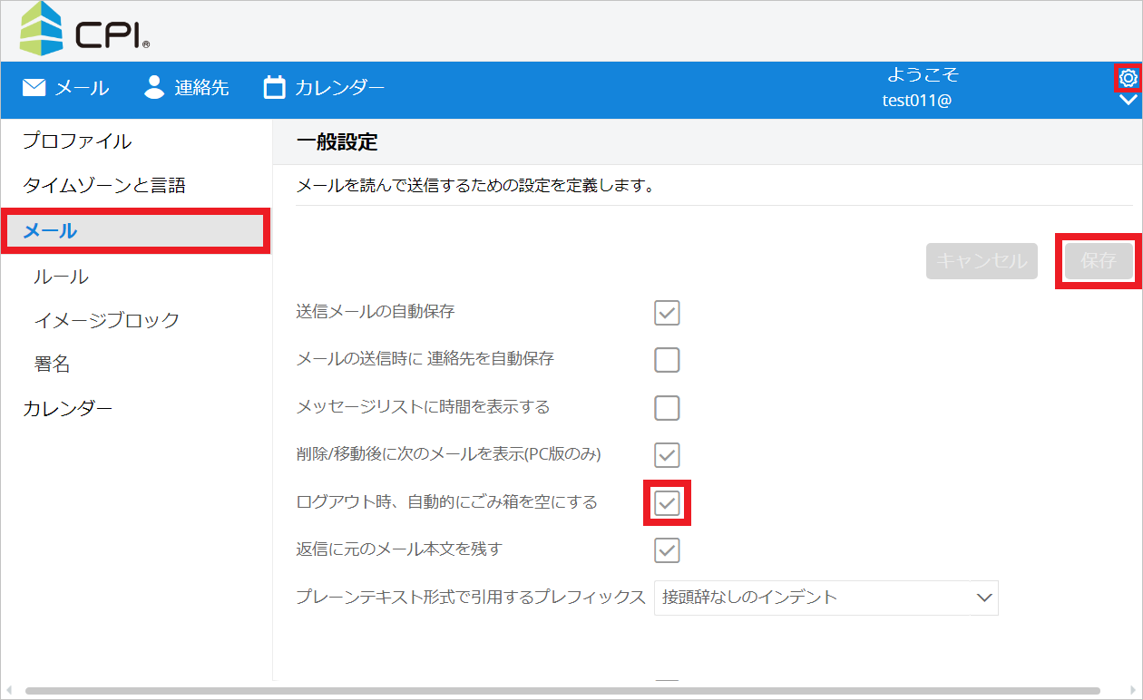 設定が完了すると、ごみ箱に格納されたメールはログアウトする際に自動的に削除されます。