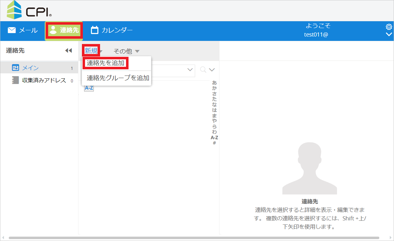 1 画面左上の「連絡先」をクリックし、「新規」> 連絡先を追加 を クリックします