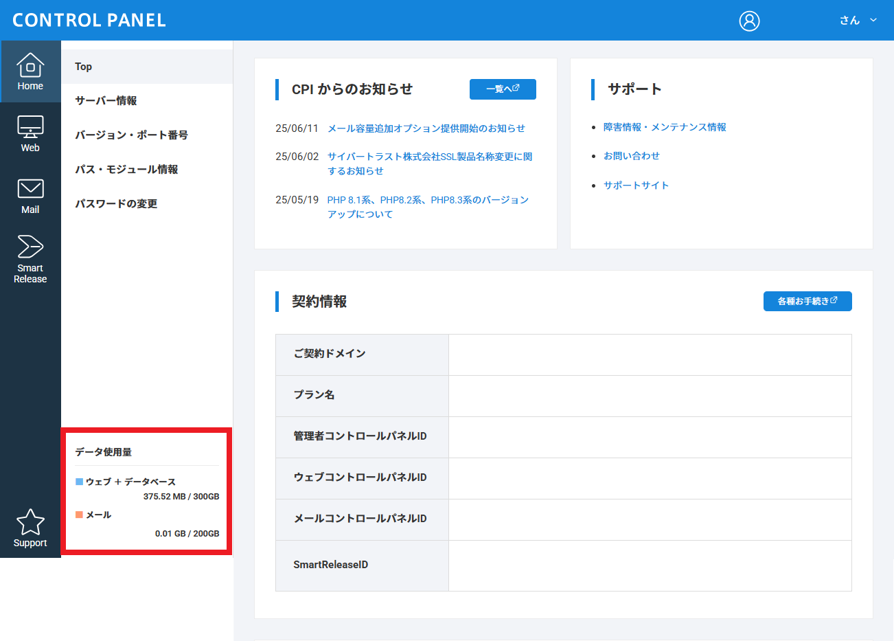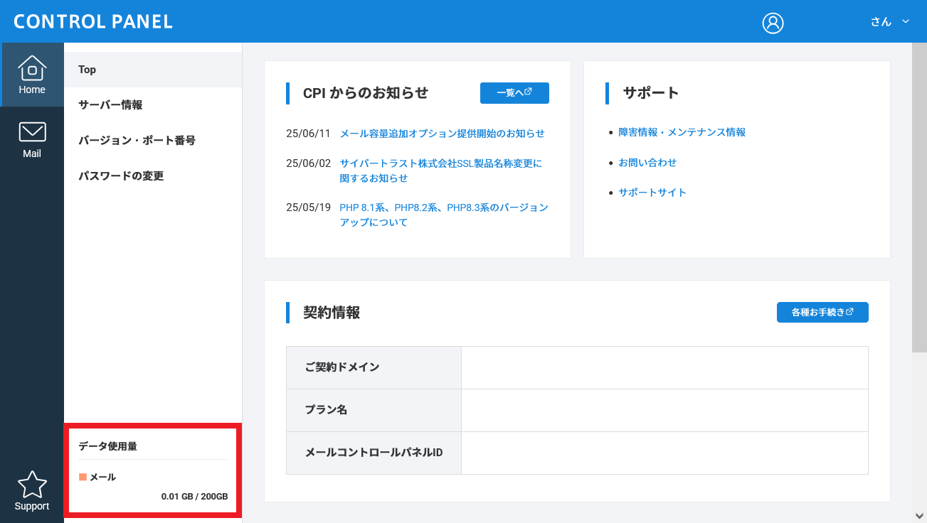 コントロールパネルにて、お客さまのデータ使用量をご確認いただけます。