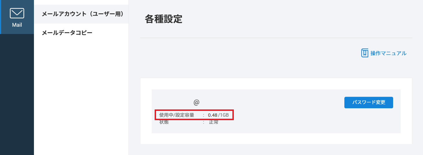 | 使用中 | 該当のメールアカウントで実際に使用している容量が表示されます。 |