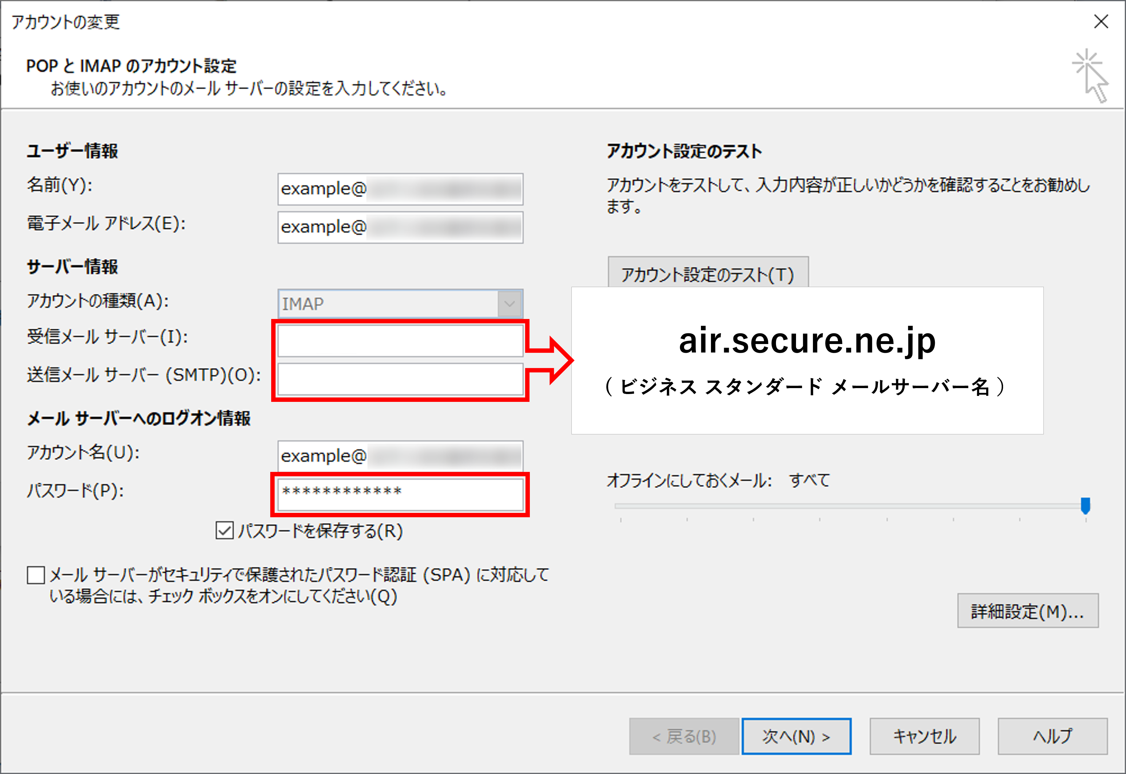 メールサーバー切替を完了後にご利用のメールソフトにおいて、送受信サーバーをビジネス スタンダード(air.secure.ne.jp)へ変更し、テストを実施してください。
