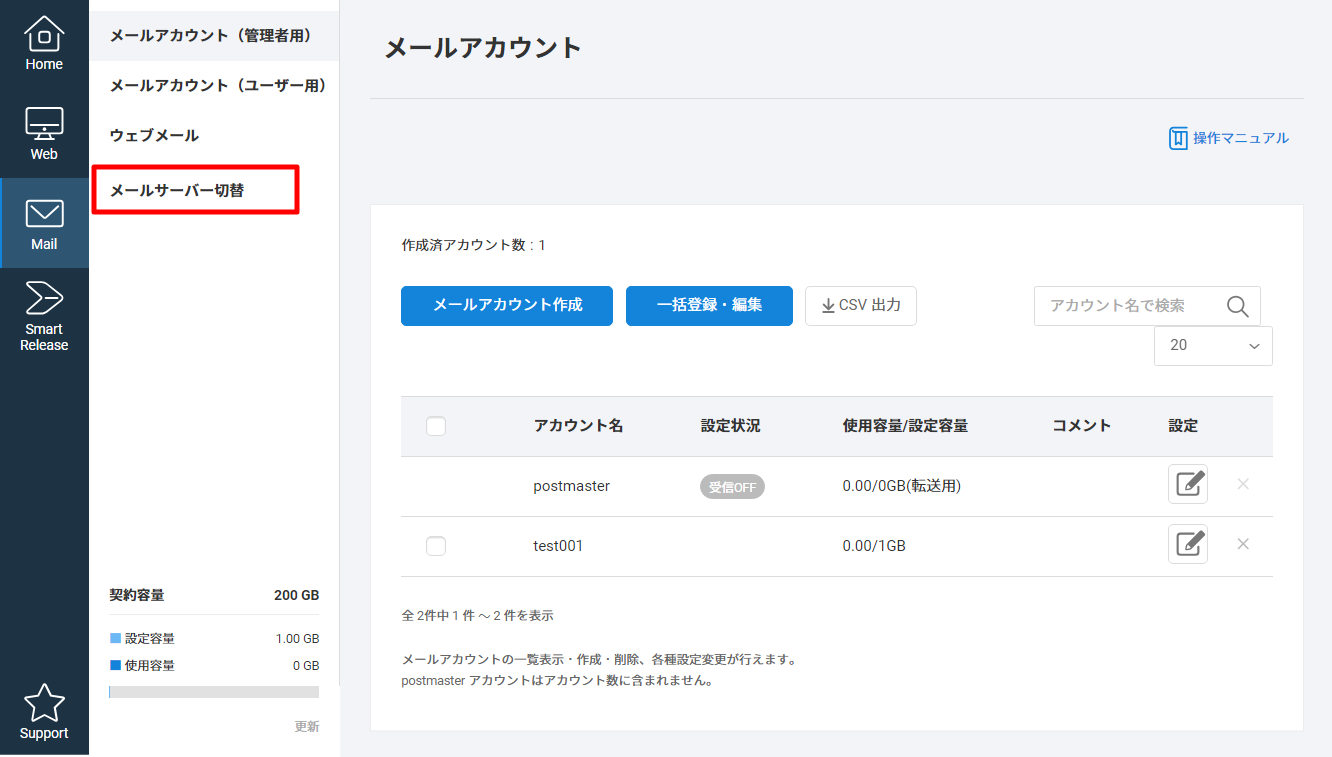 3 サイドメニューの【メールサーバー切替】をクリックします
