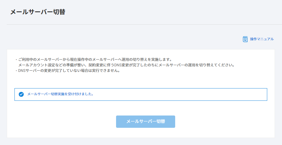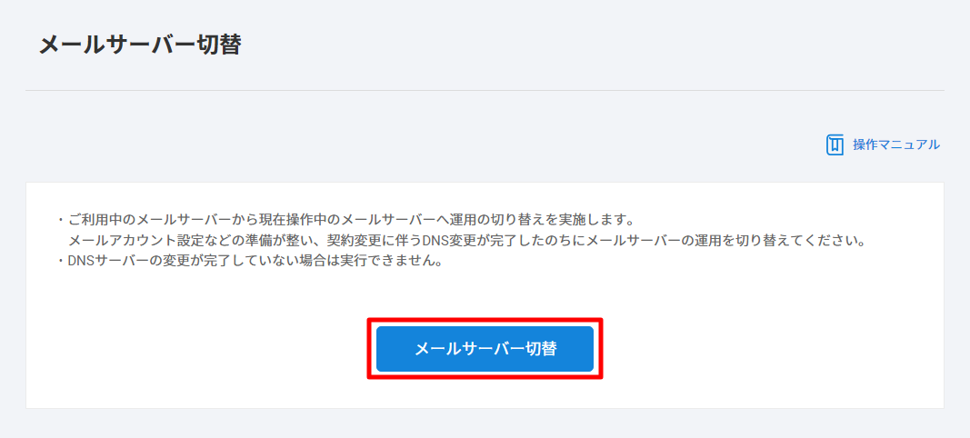 切替を完了後に、旧サーバーから新サーバーへのメールデータの移設(コピー)などをご対応いただく形となりますため、契約変更に伴う DNS 情報変更を完了次第、すぐにメールサーバー切替をご対応いただくことをおすすめします。 - メールサーバー切替前の段階で、メールの送受信テストはできません。