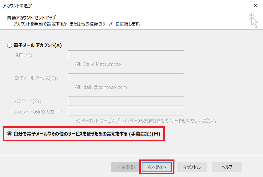 「自分で電子メールやその他のサービスを使うための設定をする(手動設定)」を選択して【次へ】をクリックします