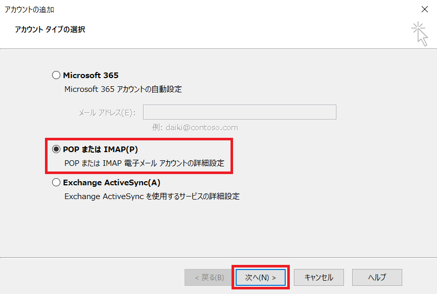 | ③ アカウントの種類 | POP3 または IMAP からお選びください。 ※ 本ご案内では POP3 を例とします。 |