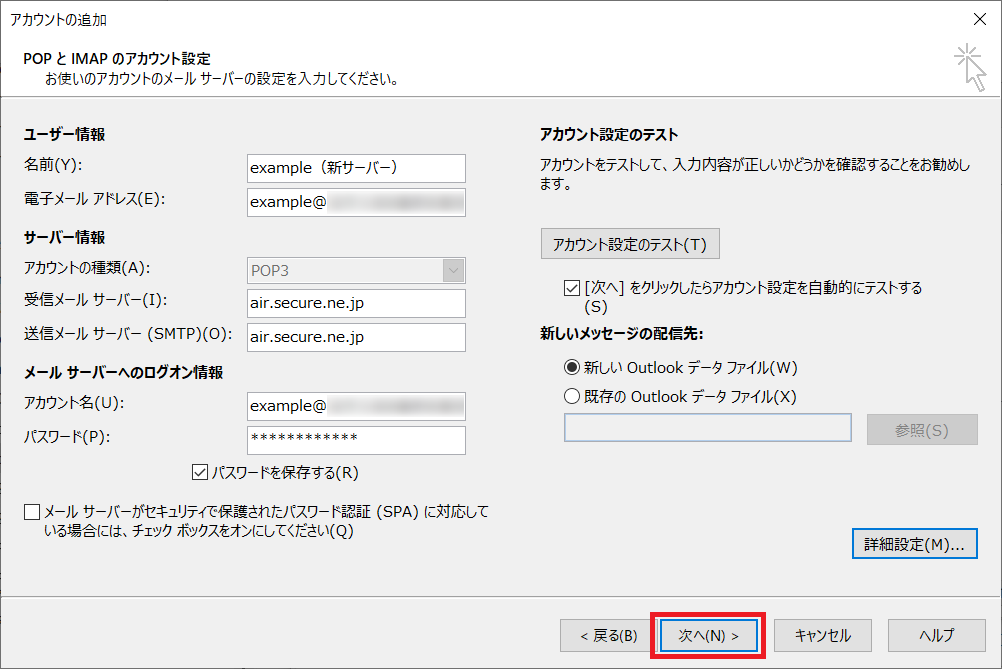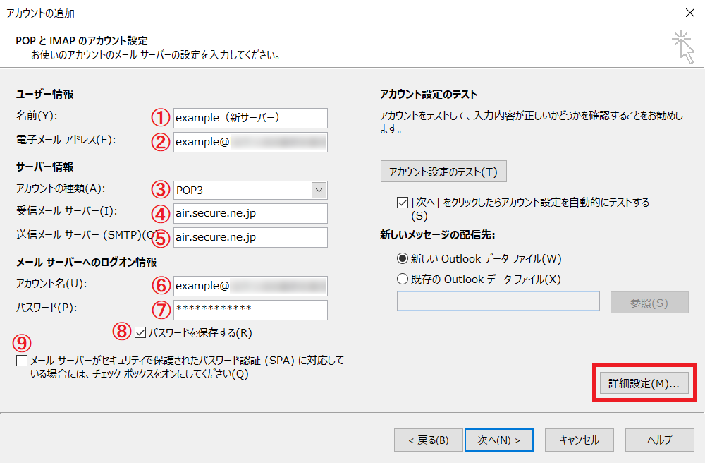 | ④ 受信メールサーバー | 新メールサーバー名(air.secure.ne.jp)をご入力ください。 |