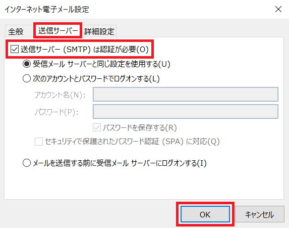 ラジオボタンは、「受信メールサーバーと同じ設定を使用する」にチェックが入っていることを確認してください。