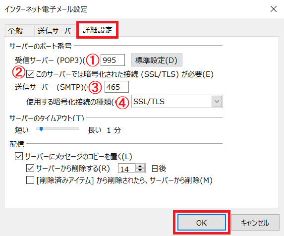 以下をご参照のうえ、お客さまのメール運用に合った内容を入力し、【OK】をクリックします