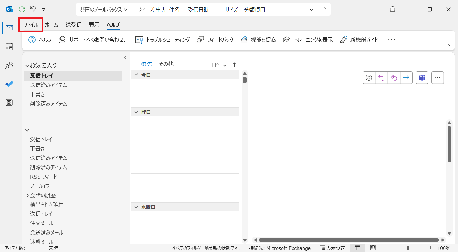 1 メールソフトを立ち上げ、【ファイル】をクリックします