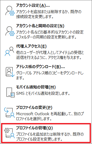 【アカウント設定】→ 【プロファイルの管理(O)】をクリックします